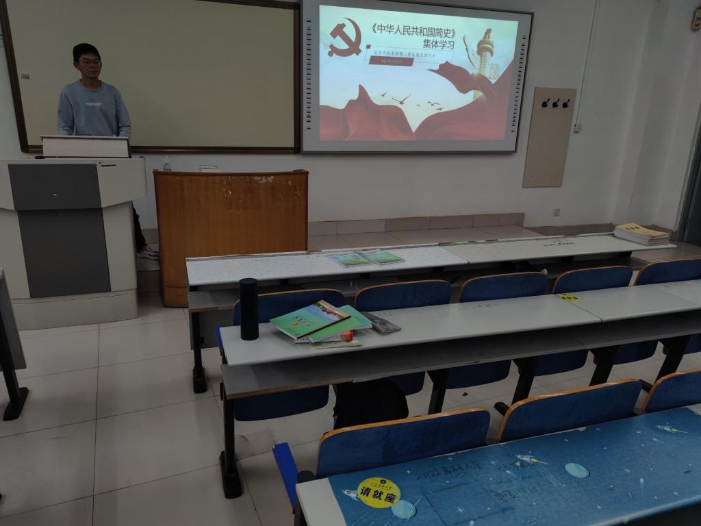 集体学习后,王绪栋与大家交流了自己的一些见解。他认为,学习《中华人民共和国简史》让他明白了中华人民共和国一路走来特别不容易。从一个落后的国家变成了现在的繁荣昌盛,一切的实践证明没有中国共产党,就没有今天的新中国。我们现在中国实力强大,在脱贫攻坚等艰难任务上取得巨大的成功。作为一名新时代的大学生,我们更应该担起接班人的己任,认真学习,为中国的发展努力奋斗。