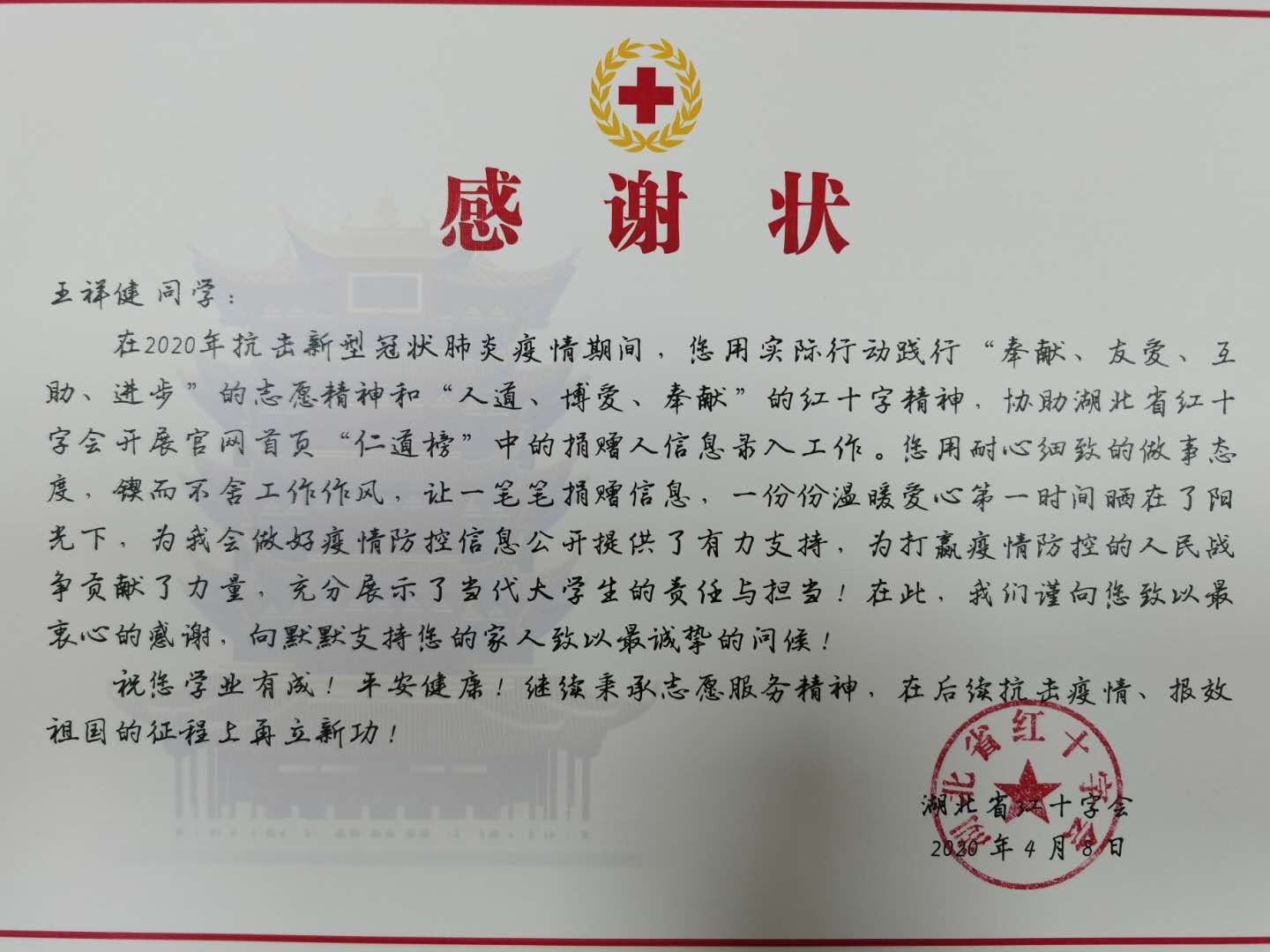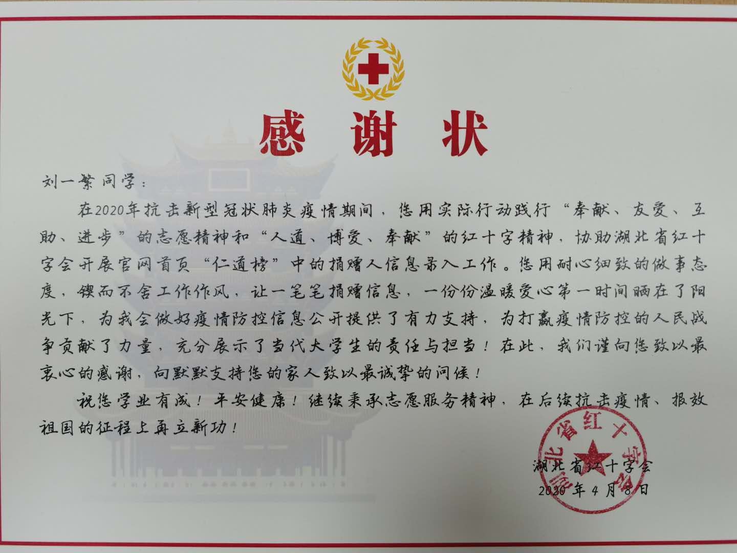 成人在线 收到湖北省红十字会感谢信