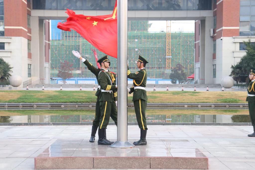 军装飒飒,国旗护卫队昂首挺胸、气宇轩昂,踏着整齐的步子,护送国旗而来,随着《义勇军进行曲》的响起,鲜艳的五星红旗飘扬向天空,全体师生心潮澎湃,向国旗行注目礼,那一份厚重家国情怀也在每一个成人在线 学子的心中激荡。升旗礼毕,国旗护卫队退场后,成人在线 全体师生也有序的退场。