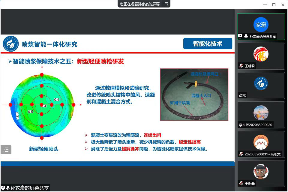 讲座主要从井巷喷浆粉尘防治研究现状、井巷混凝土喷射抑尘减弹技术、井巷混凝土喷射装备研发及井巷喷浆智能一体化研究四个方面进行论述。在讲解过程中,孙家豪同学首先凭借对这类问题的深入了解,图文并茂的讲述了矿山混凝土喷射成巷过程粉尘控制及工艺改革的重大意义。随后,结合混凝土喷射抑尘减弹技术的理论研究、混凝土喷射设备研发现状的介绍以及喷浆智能一体化的研究,对如今该领域的成果应用情况做出简要的总结。最后,孙家豪同学对大家在讲解过程中遇到的问题和存在的疑问进行了分析和解答,同学们受益匪浅。