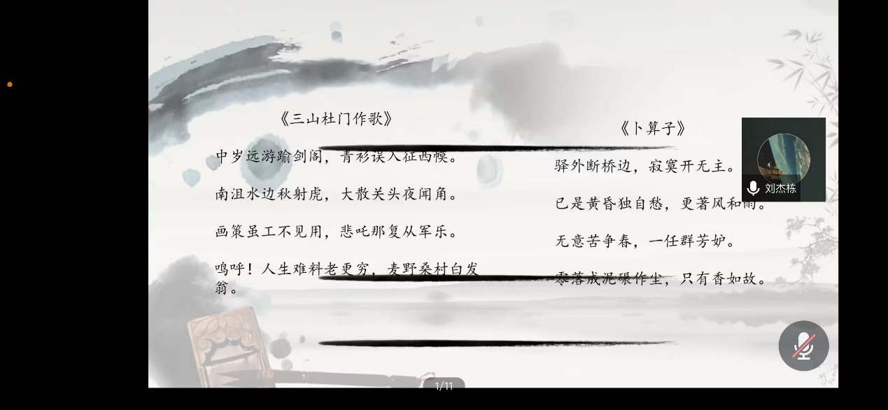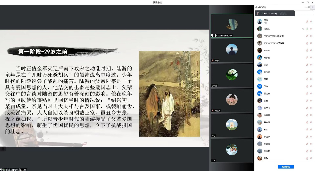 讲座首先对陆游简要介绍,将他的生平分成三个阶段,对每一阶段进行详细解读,从儿童时期的“儿时万死避胡兵”的颠沛流离,到情路不畅,“山盟虽在,锦书难托”的满腔幽怨,再到仕途坎坷,被加上“交结台谏,鼓唱是非,力说张浚用兵”的罪名,仍不坠青云之志,一生忧国忧民。刘杰栋同学利用诗文结合的方式生动地讲述了陆游的曲折而又奋进的一生,为我们展现了鲜活立体的人物形象。最后,刘杰栋同学对提出的问题和存在的疑问进行了分析和解答,同学们受益匪浅。激发了同学们对人生的思考和对陆游历经坎坷却仍坚守初心的敬佩。