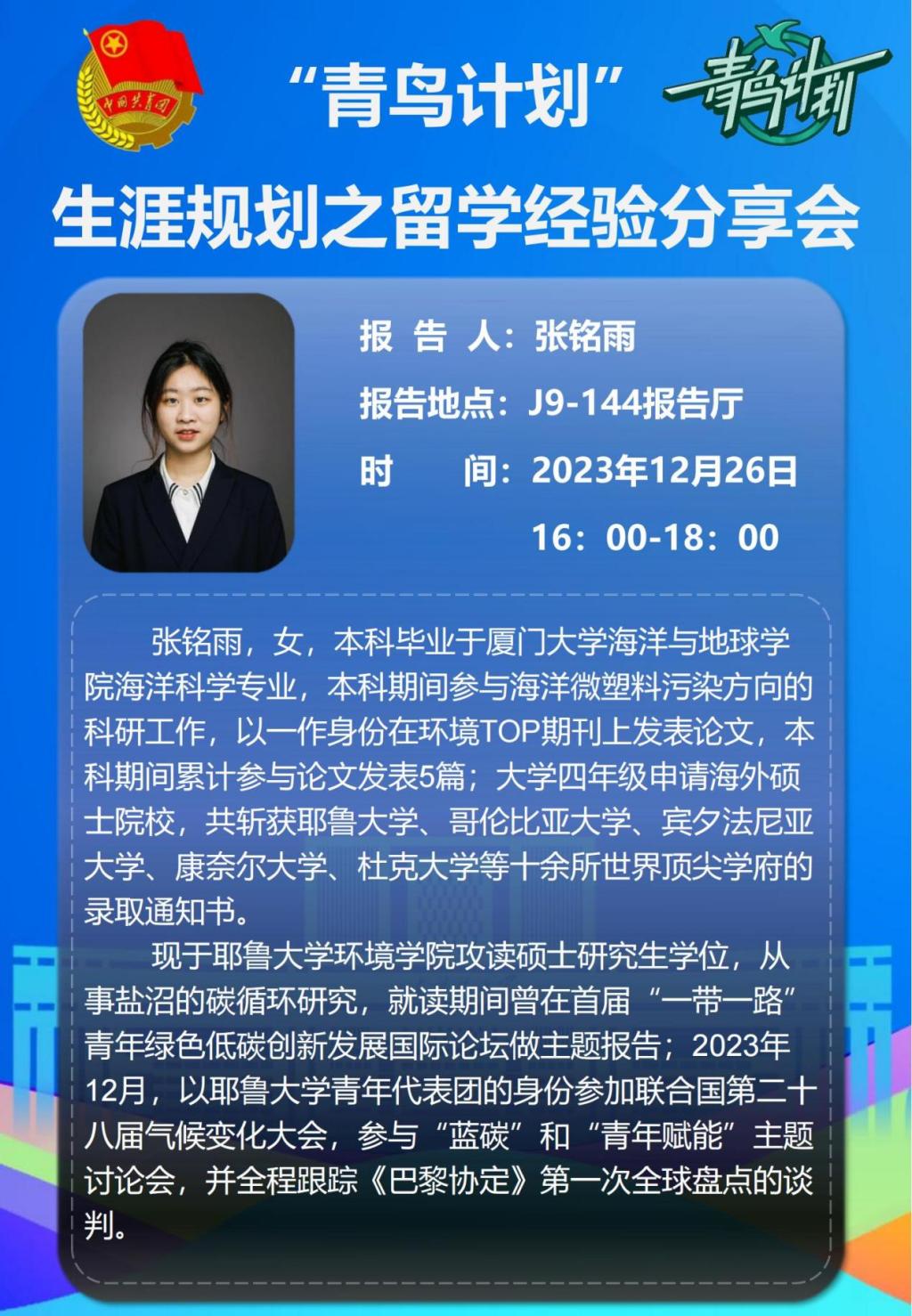点击:为服务学生学业发展、拓展国际视野、更好规划学习生活,12月26日,成人在线 在J9-144报告厅举办“青鸟计划-生涯规划之留学经验分享会”。本次分享会由耶鲁大学硕士研究生张铭雨主讲,成人在线 部分本科生参加。