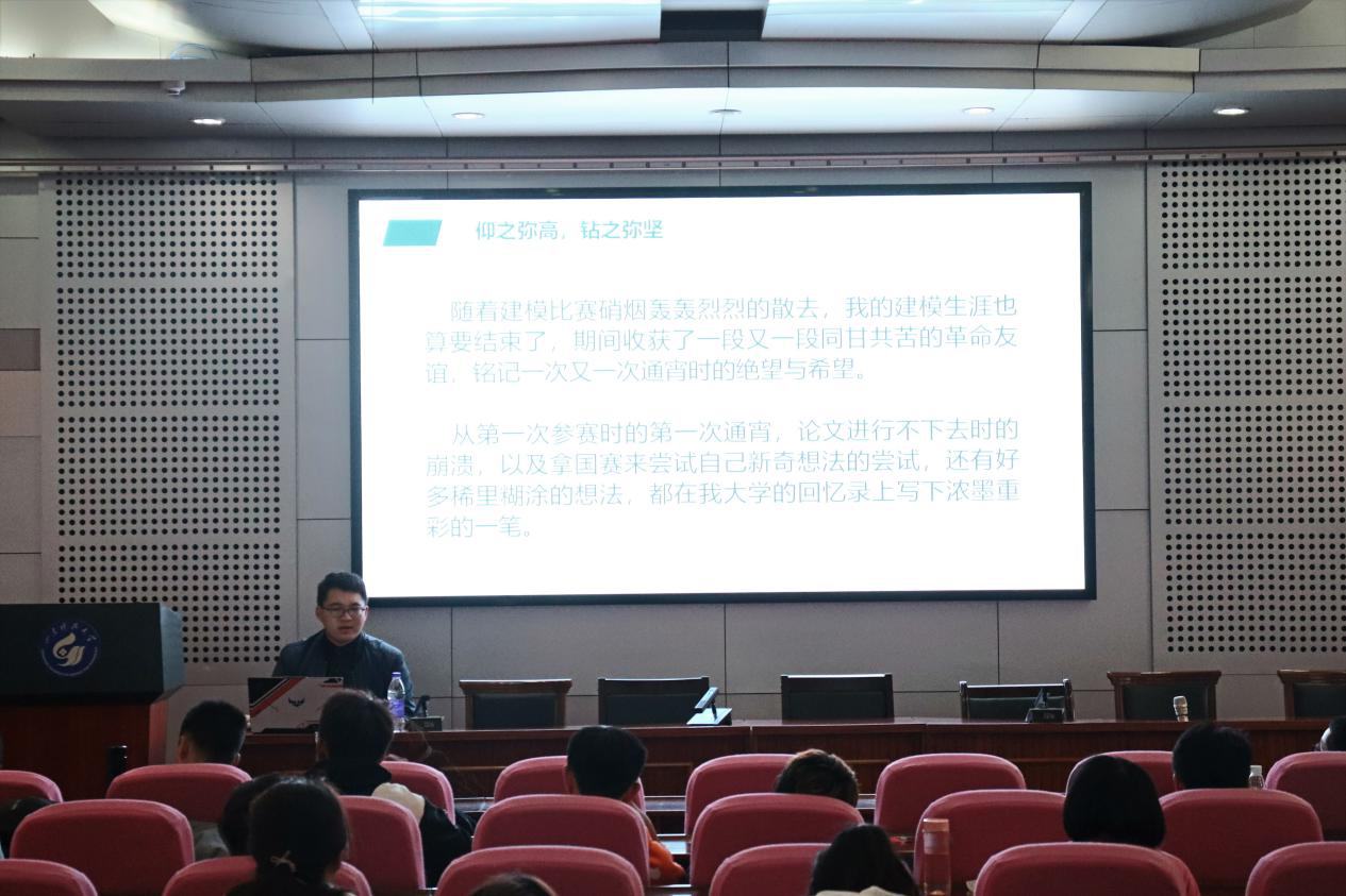 本次培训会的主讲人是成人在线 2017级安全工程专业徐鹤翔,他根据自己多年来参加数学建模比赛的经验,借助自己的参赛作品进行讲解,由浅入深,从部分到整体,对论文写作、软件使用、表格绘制、数据处理等方面进行了全方位的介绍。培训过程中台下的同学认真聆听、热情讨论,力争记录下学长每一点经验。