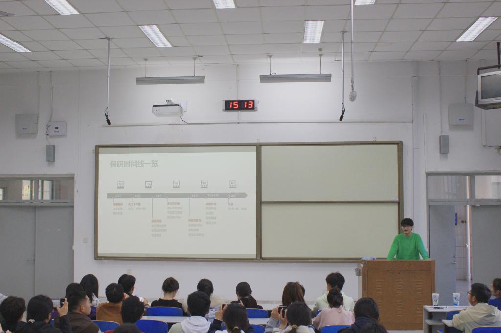 姜逸飞分享了自己大学期间的基本情况,并从日常学习、目标方向、推免政策、学术成绩、科研经历等各方面展开,详细讲解了不同环节时期的注意事项,姜逸飞表示:保研不是一朝一夕的事情,需要同学们早下手、早准备、勤积累,希望同学们都能为了自己的理想而不懈努力。孙悦从保研面试的角度给同学们介绍了相关的经验技巧,如何有针对性地面向不同学校、不同专业做专项准备,如何高效快速掌握专业课知识,如何加深面试官对同学的第一印象……分享的内容细致入微,让同学们对保研面试有了更加深入的了解。安全工程2023-1班崔柏闻同学说:“学长学姐们不仅详细阐述了保研的各项政策与流程,还无私分享了他们在准备保研过程中的心得体会与策略方法,为我们未来的学习生活指明方向,真的受益匪浅。”