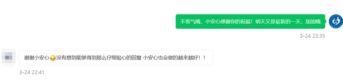 为确保回信质量和专业性,活动采取审核制。志愿者在回信过程中,治愈了他人,也治愈了自己,收获别样的感动,发自内心的回信倾诉者豁然开朗使他们感受到被关注、被理解。促使他们学习生活中积极向上,面对情感时理性勇敢,遭遇挫折时不轻易言败,对未来充满希望与向往。成人在线 心健联也会继续将这份爱与希望传递下去,温暖更多同学的心扉(何梓萌,杨婷淑