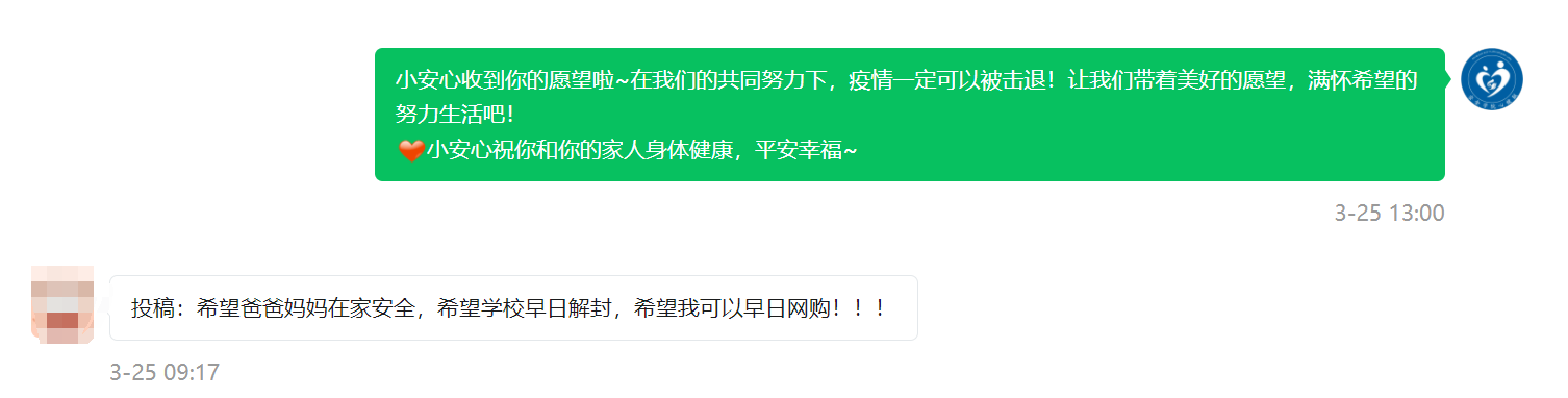 活动在开展4天后,已有千名同学参与其中,引起了热烈反响,学生通过成人在线 心健联邮箱、“成人在线 ”微信公众号合理倾诉自己的情绪,同时为抗疫一线的工作人员加油。