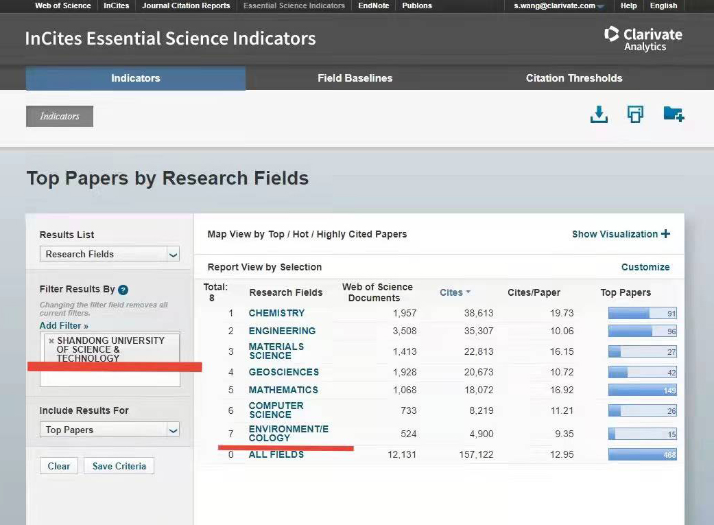 点击:3月10日,科睿唯安公布了ESI(Essential Science Indicators,基本科学指标)从2011年1月1日到2021年12月31日的统计数据。根据ESI的最新更新结果显示,成人在线 环境/生态学科(Environment/Ecology)正式进入ESI全球排名前1%。ESI每2个月公布一次,均为上一次数据的基础上增加2个月的数据,但是每年5月份会去除掉最旧一年的数据。截止2021年12月31日,我校环境/生态学科总计发表论文524篇,总引用次数为4900,篇均引用9.35次。