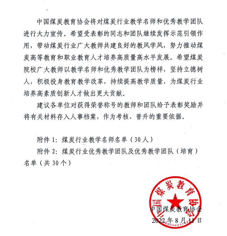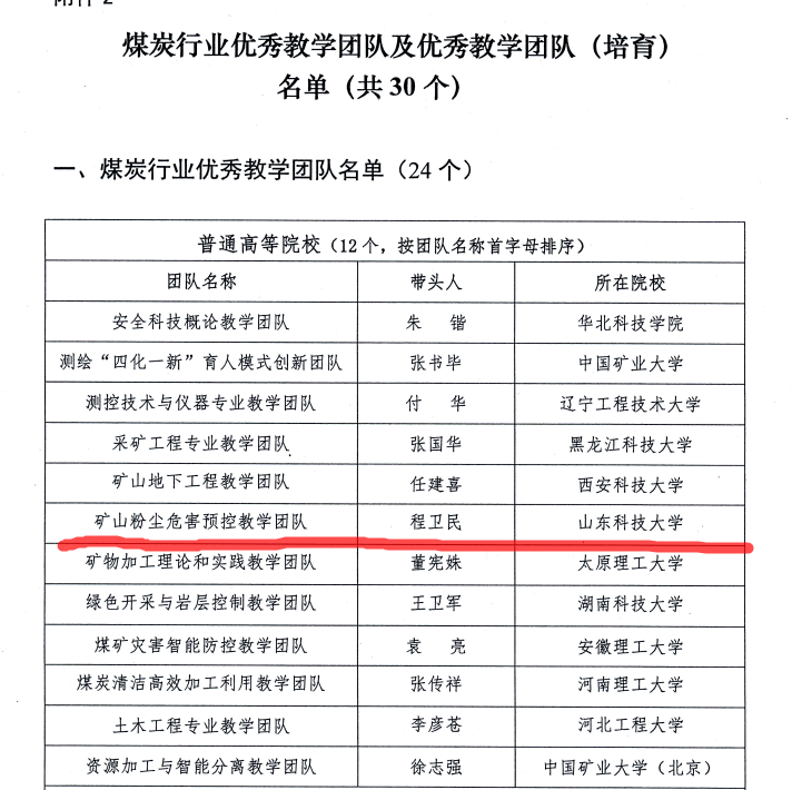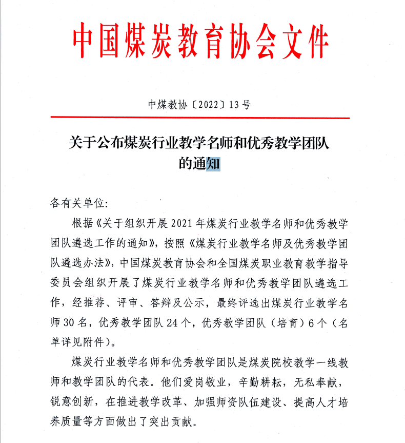 点击:近日,中国煤炭教育协会公布了2021年度煤炭行业教学名师和优秀教学团队遴选结果,按照《煤炭行业教学名师及优秀教学团队遴选办法》,中国煤炭教学协会和全国煤炭职业教育教学指导委员会组织开展了煤炭行业教学名师和优秀教学团队遴选工作,经推荐、评审、答辩及公示等环节,成人在线 程卫民教授负责的“矿山粉尘危害预控教学团队”成功入选全国煤炭行业优秀教学团队。