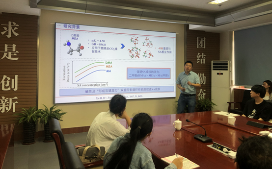 谢宏彬教授以《硫酸-三甲胺驱动的多元成核机制与动力学》为题,首先介绍了硫酸(SA)-二甲胺(DMA)成核机制主导着中国典型城市大气新粒子形成,大量有机胺对SA成核的促进效应却仍然未知,逐一评估其促进潜力的工作量是极大的。鉴于此,谢教授团队构建了有机胺促进硫酸成核潜力的高通量预测模型,并分析了硫酸-三甲胺二元成核机制、硫酸-二甲胺-三甲胺三元成核机制、硫酸-硝酸-二甲胺-三甲胺四元成核机制。报告结束,谢教授一一解答了各位老师同学提出的问题,并且结合成核机制分析了我国各地区雾霾的成因。