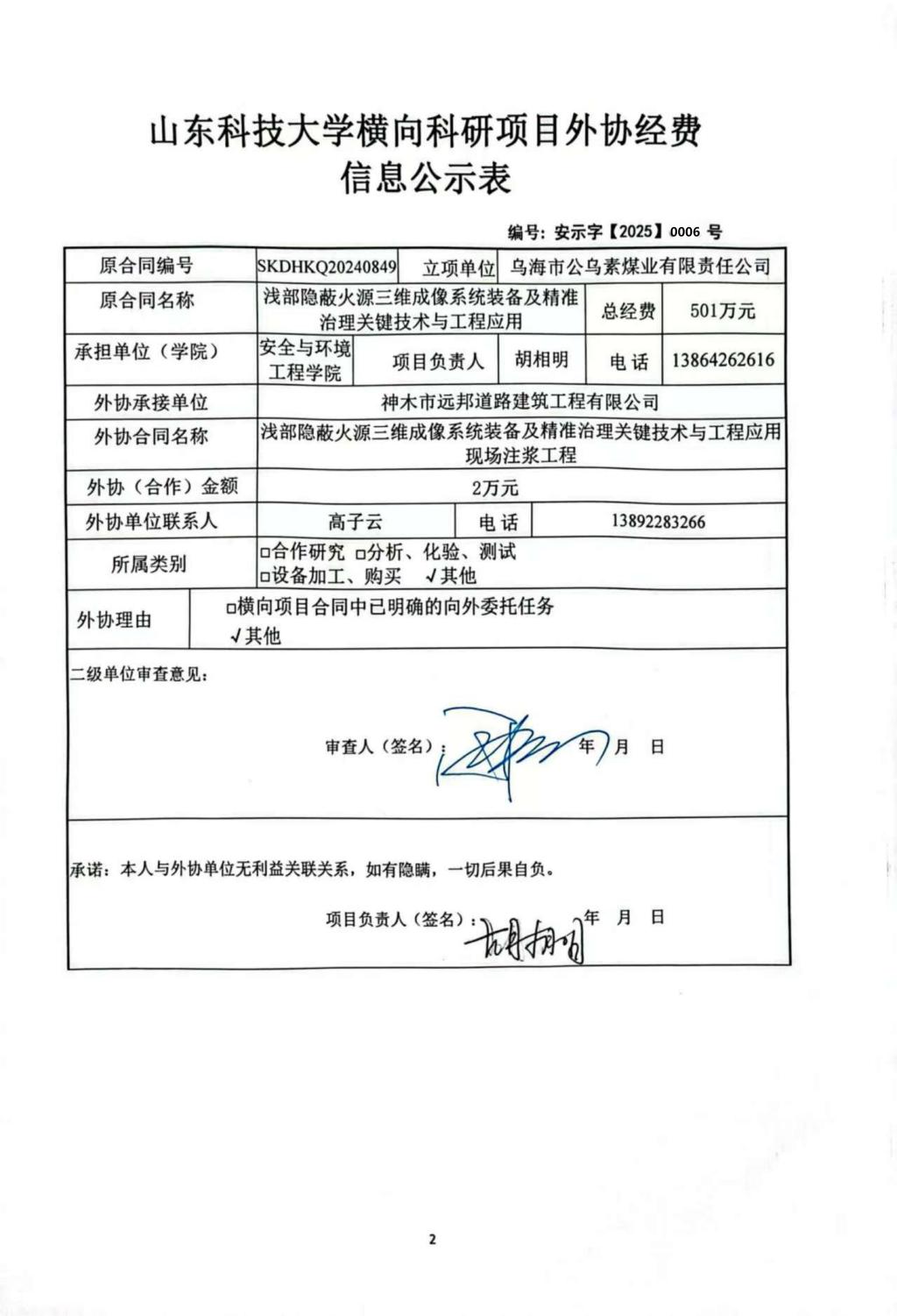 根据《山东省人民政府办公厅印发关于进一步完善财政科研项目资金管理的若干措施的通知》(鲁政办字〔2019〕120号)以及《成人在线 横向科研项目与经费管理办法(试行)》(山科大发〔2020〕64号)相关规定,现对 胡相明 为项目负责人的 浅部隐蔽火源三维成像系统装备及精准治理关键技术与工程应用 项目的外协经费情况进行公示,公示时间为 2025年12月5日-2025年12月12日 。若对本项外协经费有异议,请于公示期内向成人在线 反映并提交书面材料。