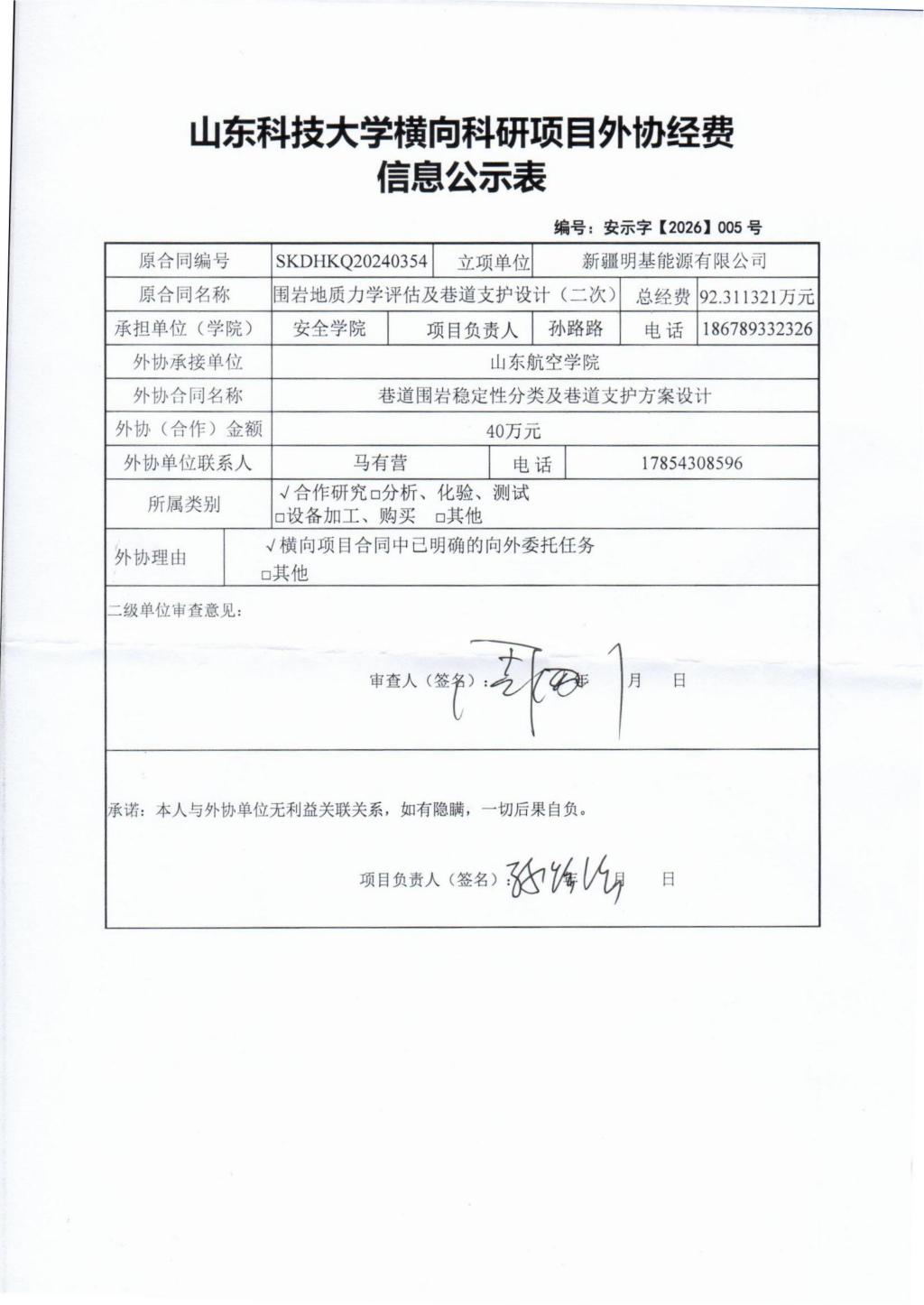 根据《山东省人民政府办公厅印发关于进一步完善财政科研项目资金管理的若干措施的通知》(鲁政办字〔2019〕120号)以及《成人在线 横向科研项目与经费管理办法(试行)》(山科大发〔2020〕64号)相关规定,现对孙路路为项目负责人的 围岩地质力学评估及巷道支护设计(二次) 项目的外协经费情况进行公示,公示时间为 2026年03月30日至2026年04月04号(五个工作日) 。若对本项外协经费有异议,请于公示期内向成人在线 反映并提交书面材料。