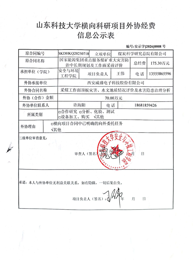 根据《山东省人民政府办公厅印发关于进一步完善财政科研项目资金管理的若干措施的通知》(鲁政办字〔2019〕120号)以及《成人在线 横向科研项目与经费管理办法(试行)》(山科大发〔2020〕64号)相关规定,现对 王伟 为项目负责人的 国家能源集团重点服务煤矿重大灾害防治中长期规划及工作面采前评价 项目的外协经费情况进行公示,公示时间为 2026年4月14日-2025年4月21日 。若对本项外协经费有异议,请于公示期内向成人在线 反映并提交书面材料。