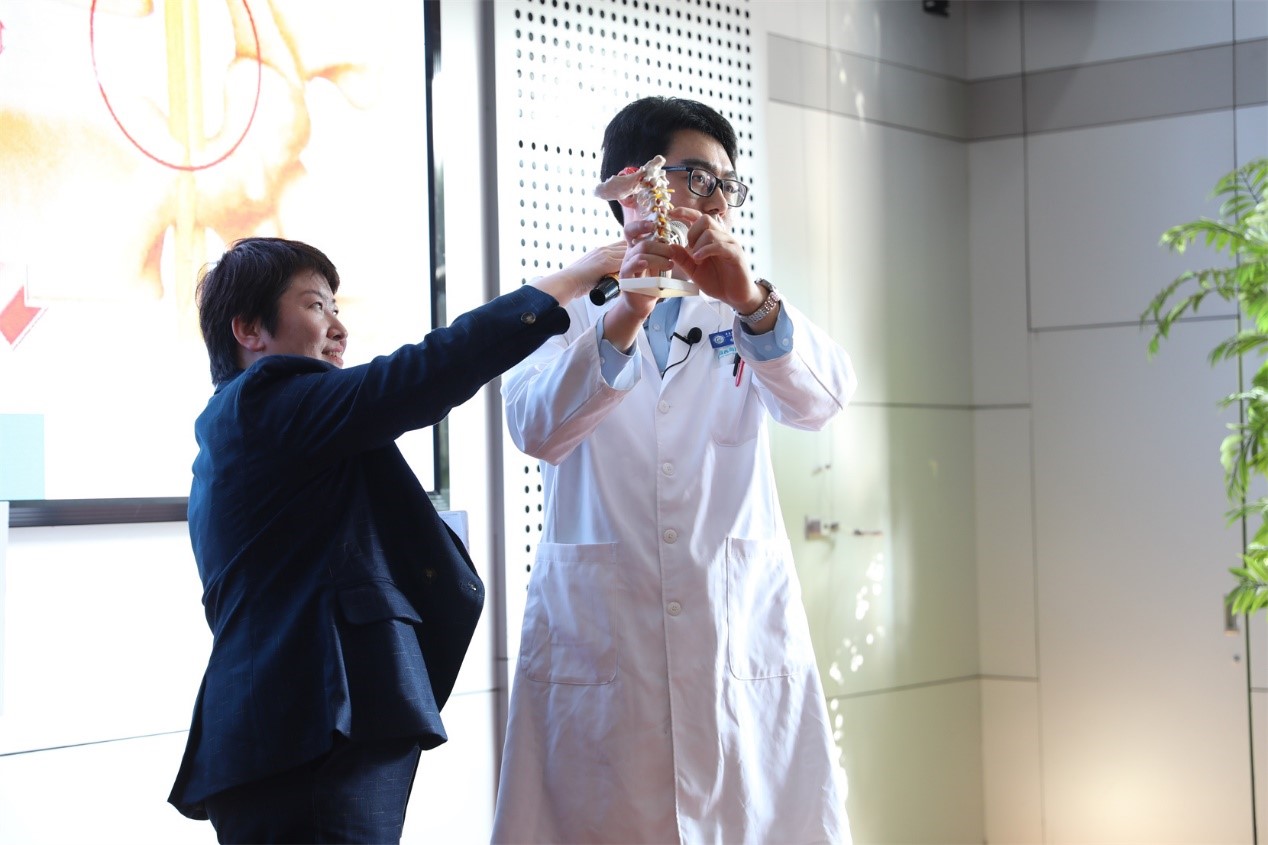 在培训过程中,李根讲师就骨健康知识进行了宣传与讲解,包括PPT演说,视频观看和现场示范等。李根讲师指出,日常工作生活例如久坐电脑等长时间保持一个状态导致的酸痛,在医学上不被称作颈椎病,如果能及时的休息和运动,能有70%以上的人不会患上颈椎病,因此李根着重介绍了肩颈部酸痛恢复训练方面的基本知识,“手把手”为大家演示肩颈部放松动作的具体操作以及动作要领。