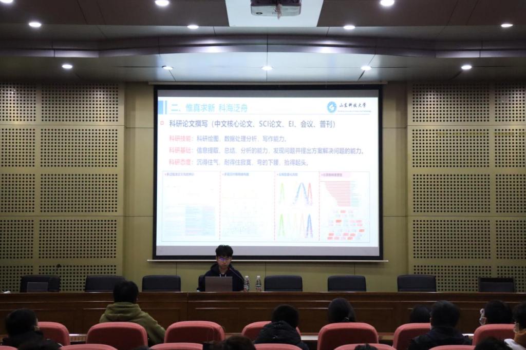 会议伊始,高鹏首先介绍了自己的基本情况,并根据自身的经验对培养方案进行分析,提醒同学们要注重自己的学习成绩,在强抓专业课成绩的同时,也不要让公选课成绩拖后腿。随后,高鹏又聚焦大学生科研创新方面进行补充,从科研技能、科研基础、科研态度三个方面进行了经验分享。他表示,提高科研创新能力,学会使用各种软件是关键。他阐明,在这个挑战与机遇并存的漫漫科研征程中,提高自学能力是重中之重,只有弯得下腰,抬得起头;做实、做稳技术学习,发现、突破技术难题;最后再辅之以出类拔萃的竞赛成绩与获奖经历,才能超越自我,去往更好的平台。此外,高鹏还强调了“五育并举”的重要性,鼓励同学们积极参与学生工作、文体活动以及社会实践活动,努力拼搏,实现德智体美劳全面开花。最后,高鹏以“天道酬勤恒者胜”做结,勉励大家在大学生活中把路走宽的同时也要把路走窄,关于学习要提高效率,合理规划;关于学科理解要大而全,小而专。在同学提问环节,大家就学习计划等方面提出自己的问题,高鹏耐心解答,认真讲解,为低年级同学提供了详细的信息和方案。