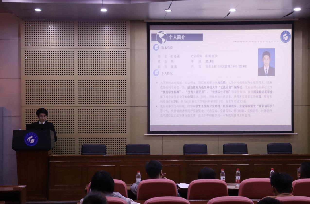 答辩会上,候选人声情并茂的进行了个人事迹展示:思想积极进步,在党团组织中担任职务;综测、专业成绩名列前茅;学科竞赛获奖无数;热心公益积极参与志愿服务......他们以优异的成绩,优秀的事迹充分展现新时代安全学子昂扬的精神风貌。来自2019级环境工程1班李洪磊通过展示自己所参加的科技创新竞赛和取得成果震撼全场;来自安全工程2020级1班的邴誉娴结合自己学习成绩和出色的学生会工作表现赢得现场评委阵阵掌声;还有的同学着重对自己的特长进行详细地叙述,将自己在某一特长的挖掘、发展以及所取得的成就进行全方位展示,给大家留下了深刻的印象。