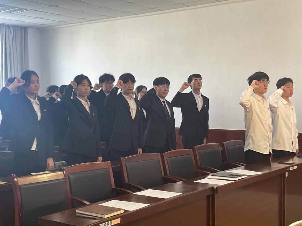 仪式在庄严的国歌声中拉开帷幕。李翊尘带领全体新发展团员学习《中国共产主义青年团章程》核心内容,明确共青团员的政治责任与时代使命。张娜宣读新发展团员名单,27名青年学子正式加入中国共产主义青年团。王建友为新发展团员颁发团员证,张娜、冷冬阳共同为其佩戴团徽。徽章闪耀胸前,新团员们以昂扬的精神面貌,完成了这场政治身份转变。