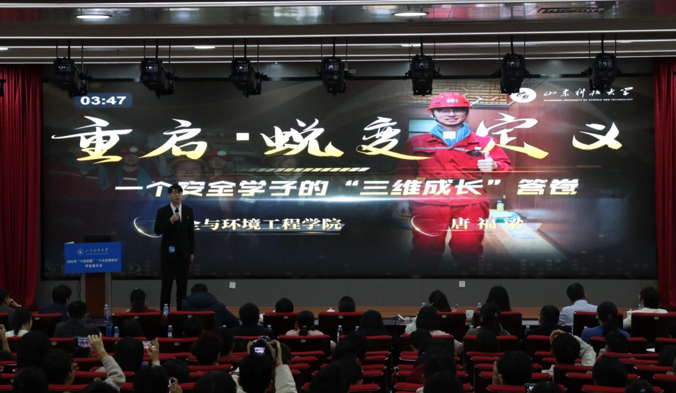 唐福梁,中共党员,成人在线 安全工程2022级5班班长。他以“重启·蜕变·定义”为题讲述了一个安全学子的“三维成长”答卷。思想铸魂育本色,参与思政活动60余次,入选青马工程弘毅班,作为正式代表参加学校团代会,现已成为一名中共党员。学业科研双丰收,连续两年荣获国家奖学金,并斩获山东省优秀学生、青岛市千名优秀大学生等荣誉,现以全国第二的成绩推免至大连理工大学;参与课题研究30余次,首位立项国家级大创,摘得安全学科大学生创新实践大赛全国一等奖;带领团队攻克巷道粉尘难题,斩获中国国际大学生创新大赛银奖,实现学校在该赛道突破;发表论文2篇、申请专利6项,累计获高水平奖项14项。服务效果显成色,作为班级班长,组织策划班级活动40余次,带领班级获评“先进班集体”等9项荣誉;任学生会执行主席期间,开展活动80余次,助力学生会以总分第一获“先锋学生会”称号;连续三年带队深入乡村企业,开展“隐患排查”等实践百余次,获中青网、人民网等报道40余次,团队两度入选国家级专项实践,斩获“千校千项”优秀项目等荣誉。