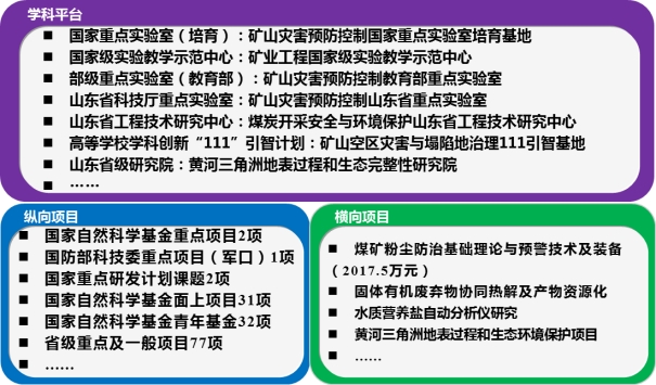 职业卫生工程专业建设以安全科学与工程学科建设平台为依托,具备国家“111计划”学科创新引智基地平台、矿业工程国家级教学示范中心两个国家级教学与科研平台,省部共建矿山灾害预防控制国家重点实验室培育基地、山东省煤炭开采安全与环境保护工程技术研究中心、黄河三角洲地表过程和生态完整性研究院、黄河流域生态环境保护产业成人在线 、黄河流域脆弱生态保护修复技术协同创新中心、青岛市近海环境监测与污染防治装备工程研究中心、矿山灾害预防控制教育部重点实验室、矿山灾害预防控制山东省科技厅重点实验室、山东省矿产资源清洁利用重点实验室等省部级平台。