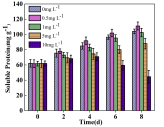 研究发现,Cr(VI)胁迫环境对球等鞭金藻生物量,叶绿素a和可溶性蛋白含量产生影响,其浓度为0.5mg/L时,可促进生长、叶绿素a和可溶性蛋白的合成增多。浓度由1.0mg/L增加至10.0mg/L时,微藻的生长受到抑制,叶绿素a和可溶性蛋白的合成相应减少。并引起微藻细胞结构的破坏。