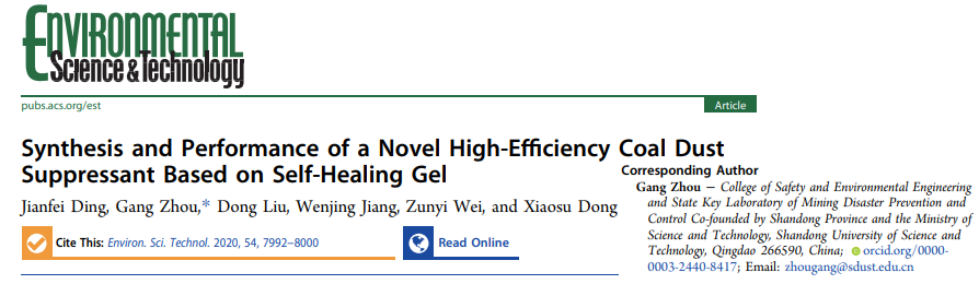 点击:2020年7月1日,成人在线周刚教授粉尘职业健康防护课题组在环境领域国际顶级期刊《Environmental Science & Technology》(IF=7.864)上发表了题为“Synthesis and Performance of a Novel High-Efficiency Coal Dust Suppressant Based on Self-Healing Gel”的论文。周刚教授为该论文的唯一通讯作者,第一作者为2017级硕士研究生丁建飞。