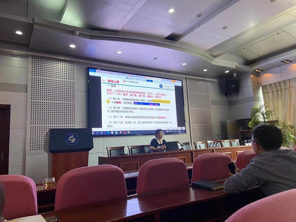 会上,刘音带领青年教师们学习了学校和成人在线 教学相关文件,如《成人在线 本科教学基本规范(试行)(山科大教学[2007]13号)》、《成人在线 加强本科实习教学与管理的暂行规定》等文件,详细介绍了教学过程的各个环节,从备课、上课、答疑、考试等方面全方位介绍了青年教师教学过程中需要注意的问题和方式方法。刘音强调,备课需要备方案、备大纲、备课程、备学生。在授课过程中,教师应注意学生的总体培养方案和课程大纲,并根据学生的状态和课程的情况进行调整。在上课时,必须严格遵守学校相关规定,避免教学事故的发生。同时,刘音为青年教师介绍了利用学习通等教学新工具进行教学改革创新的经验。