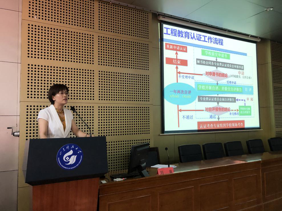 会议第二阶段,教科办主任陈海燕进行了工程教育认证讲座。简要介绍了工程教育认证相关的流程、标准等内容,并结合当前2020版课程教学大纲编制工作,介绍了基于工程教育认证理念的教学大纲编写注意事项及课程评价相关内容。