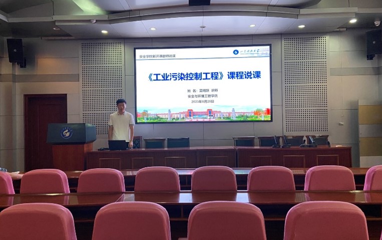 吴明跃老师对《工业污染控制工程》课程进行说课,吴明跃老师以导入新课的形式对课程进行解说,提出如何将“黑水臭水”、“工业废水”转化为“清水绿水”,由此引发学生思考,讲解水污染防治的方法,内容生动深刻。