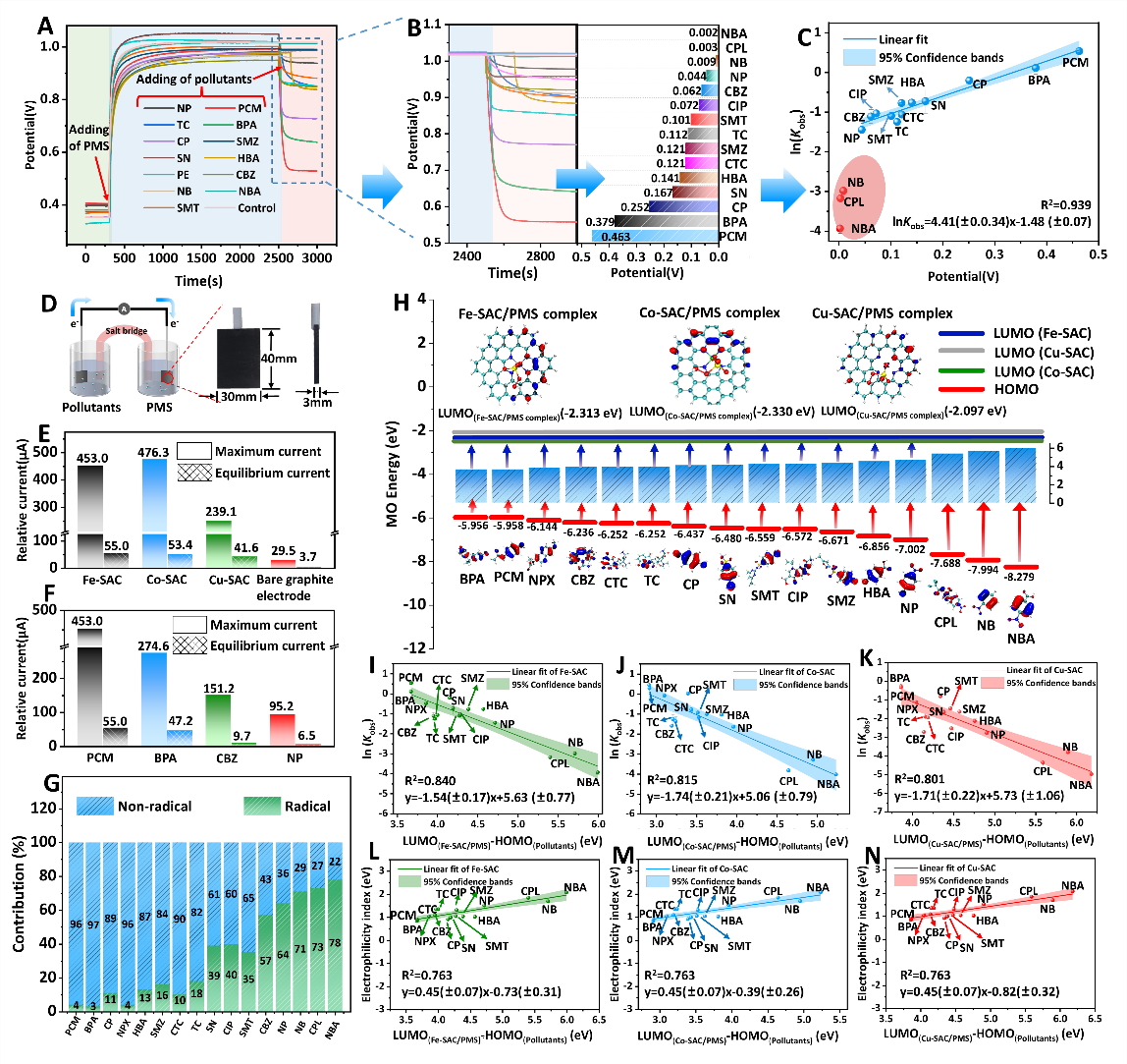 该工作首次报道了不同M-SACs/PMS体系的氧化性能和机制不仅取决于M-SACs的配位结构,更需要考察目标污染物与M-SACs/PMS体系对氧化性能/途径的共调节作用。研究结果表明:不同污染物的给/接受电子能力(以亲电指数为指标)与这些污染物在M-SACs/PMS体系中的降解动力学密切相关。不同的M-SAC/PMS体系中,非自由基氧化(主要为电子转移机制(ETP))对亲电指数较低的污染物的作用远超自由基氧化。相比之下,污染物的亲电指数越高,非自由基作用越弱,自由基氧化对污染物的作用越重要。此外,电化学和DFT计算证实了污染物和M-SACs共介导ETP作用的普遍性,可以实现M-SACs/PMS体系氧化效率和途径的调控。