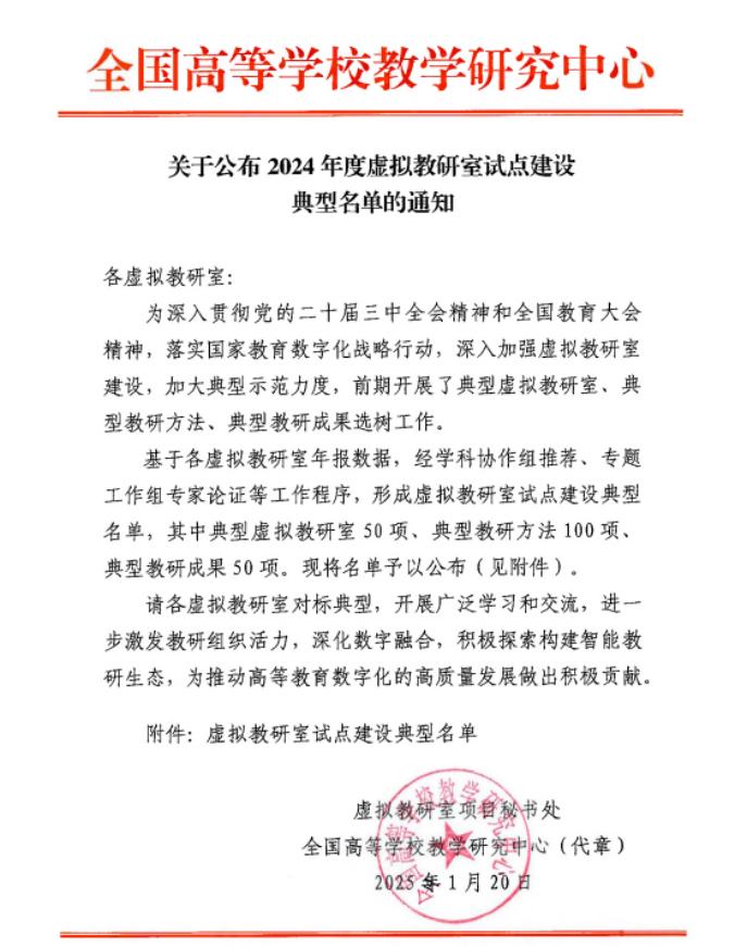 点击:近日,教育部虚拟教研室项目秘书处和全国高等学校教学研究中心公布了2024年度虚拟教研室试点建设典型名单,成人在线安全工程专业虚拟教研室由程卫民教授负责的《东中西部高校课程建设分享沙龙》入选典型教研方法,受到教育部虚拟教研室项目秘书处和全国高等学校教学研究中心表彰。