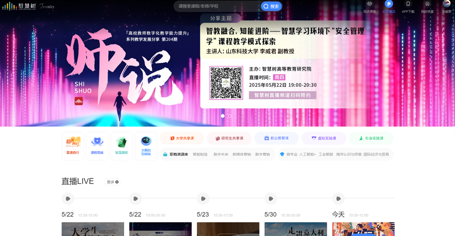 点击:2025年5月22日,智慧树高等教育研究院举办“师说——高校教师数字化能力提升”系列教学发展分享活动,成人在线 李威君副教授以《智教融合,知能进阶——智慧学习环境下“安全管理学”课程教学模式探索》为主题,通过智慧树微信视频号及直播频道双平台同步开讲,吸引全国2000余名高校教师在线参与,共同探讨数字化时代教学的创新路径。
