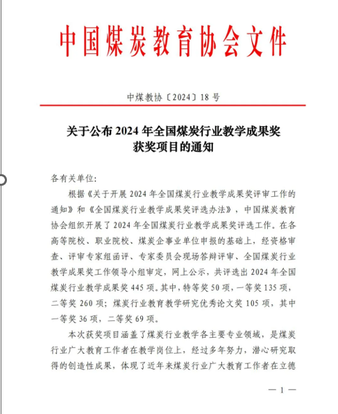2024-09-23近日,中国煤炭教育协会公布了2024年全国煤炭行业教学成果获奖项目,成人在线获2024年全国煤炭行业本科教学成果一等奖3项,二等奖1项,研究生教学成果一等奖1项,二等奖2项的好成绩。其中程卫民教授团队的《高水平学科引领下的安全工程专业数智化人才培养体系改革与实践》、王刚教授团队的《教材建设与课程教学的协同创新与实践—<矿井通风与安全(融媒体版)>(教材)》、和刘音教授团队的《虚实联通探新路,数智融合助教研-安全工...
