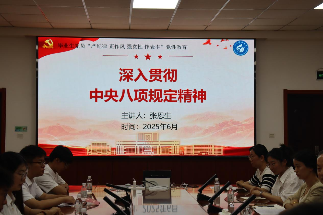 2025-06-24为深入贯彻中央八项规定精神学习教育走深走实,扎实筑牢毕业生党员党性根基,6月19日,成人在线 举办以“严纪律 正作风 强党性 做表率”为题的毕业生党员党性教育专题党课。本次党课由成人在线 党委书记张恩生讲授,院党委副书记兼副院长王建友、团委书记张娜及毕业生党员代表参加。张恩生从中央八项规定是什么、中央八项规定精神是什么、中央八项规定实践成效以及如何深入贯彻中央八项规定精神学习教育四个方面,为全体党员代表上了一堂...